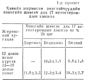 Бидний судалгаагаар эрүүл, хэвийн жирэмсэн эмэгтэйчүүдийн хоногийн шээсэн дэх 17 кетостреоидын хэмжээ жирэмсний 4—28 долоо хоногт 9,8±1,6—12,7±3,5мг 24 цаг байлаа. Энэ нь бусад судлагчынхтай дүйж байна.