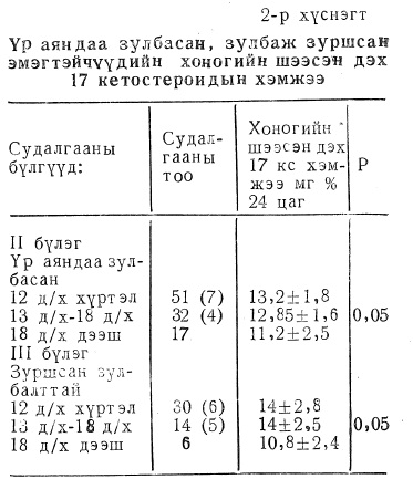 Үр аяндаа зулбасан эмэгтэйчүүдийн 11%, зулбаж зуршсан эмэгтэйчүүдийн 22%д 17 кетостроидын хэмжээ ихсэж байв. Энэ нь хяналтын бүлэгтэй харьцуулахад статистикийн үнэн магадтай ихсэж байв. (Р0,05). 17 кетостероид ихэссэн эдгээр эмэгтэйчүүдийн II бүлгийн 9, III бүлгийн 12 эмэгтэй ус ихтэй байлаа.