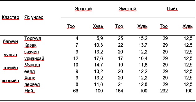 Хүснэгт 1. Судалгаанд хамрагдсан настны хүн ам зүйн ерөнхий шинж (үндэс угсаа ба хүйсээр)