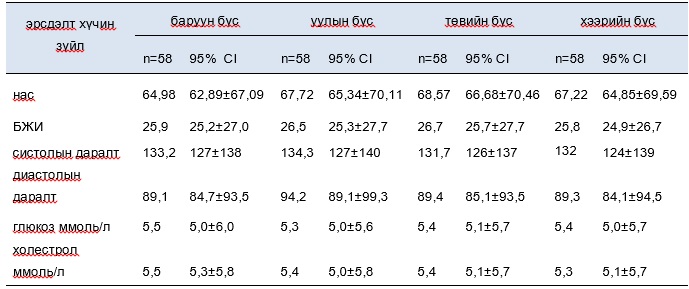 Судалгаанд хамрагдсан настны артерийн даралт ихэсэлтд нөлөөлөх хоёрдогч хүчин зүйлсийг хүснэгт 2-т харууллаа. Эрсдэлт хүчин зүйлс бүсүүдэд ялгаатай байж болзошгүй гэсэн таамаглал дэвшүүлэн шинжлэхэд статистик ач холбогдол бүхий ялгаагүй байлаа. Хүснэгт 2. Судалгаанд хамрагдсан настны эрсдлийн байдал (бүсээр)