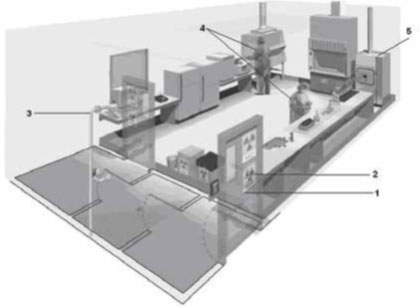 Тайлбар: 2-р зэрэглэлийн лабораторийнхтой харьцуулахад нууцлал/тусгай зөвшөөрлөөр нэвтэрдэг давхар хаалга (1), хаалган дээр зэрэглэлийг бичсэн анхааруулга бүхий тэмдэг (2), шүршүүр (3), хувийн хамгаалах хувцас хэрэгсэл (4) ба автоклав (5) нэмэгдсэн байна.