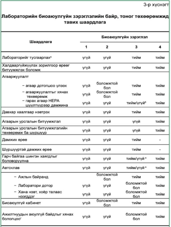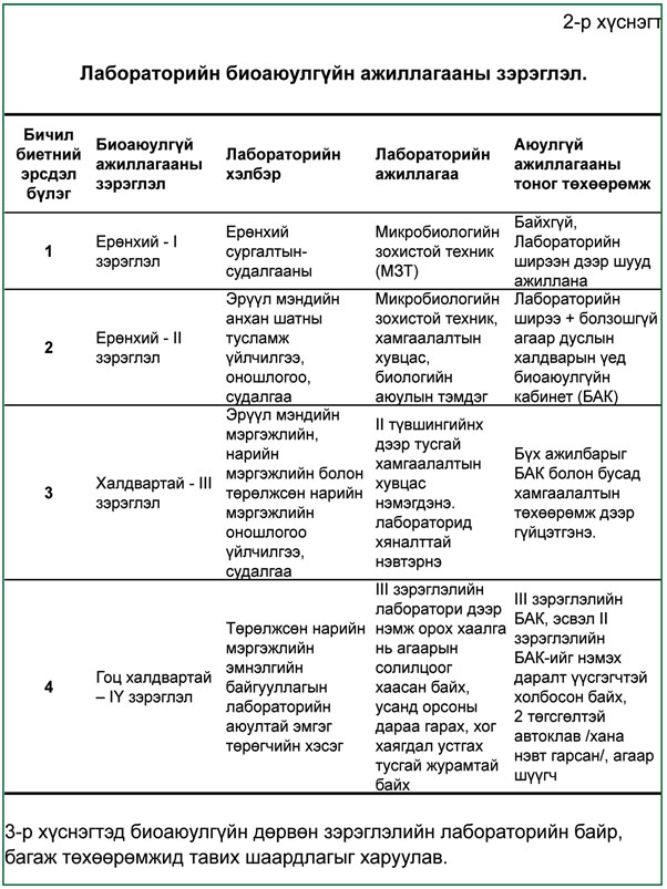 Лабораторийн биоаюулгүйн зэрэглэл. Хавсралтад заасан бичил биетний эрсдлийн бүлгийн ангилалтай уялдуулан бичил биетэнтэй ажилладаг лабораториудыг биоаюулгүйн ажиллагааны 4 зэрэглэлд хамааруулан ангилна (2-р хүснэгт).